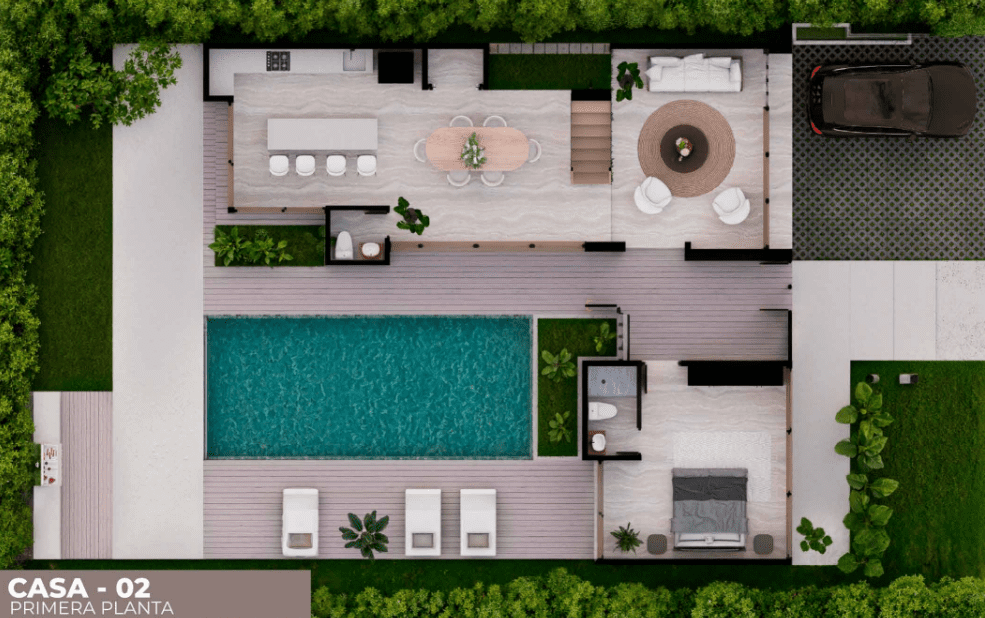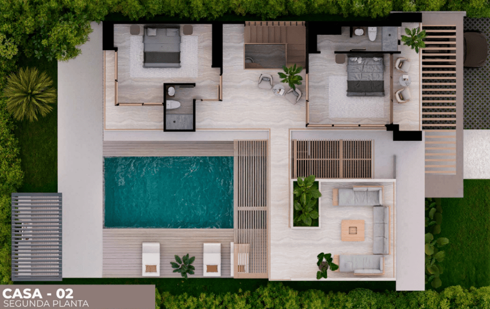 Unlike the more traditional distribution of other models, Casa Tipo 2 is designed with an expanded social footprint. The ground floor is a masterclass in fluid design, featuring an open-concept layout that flows seamlessly onto an oversized integrated pool deck—the largest in the collection. The experience of the home extends upward to a magnificent second-floor terrace, providing a private “social summit” with panoramic views of the lush tropical surroundings. Whether you are hosting sunset gatherings or enjoying a quiet morning overlooking your private oasis, Casa Tipo 2 offers a lifestyle of integrated indoor-outdoor entertaining that is both effortless and extraordinary.